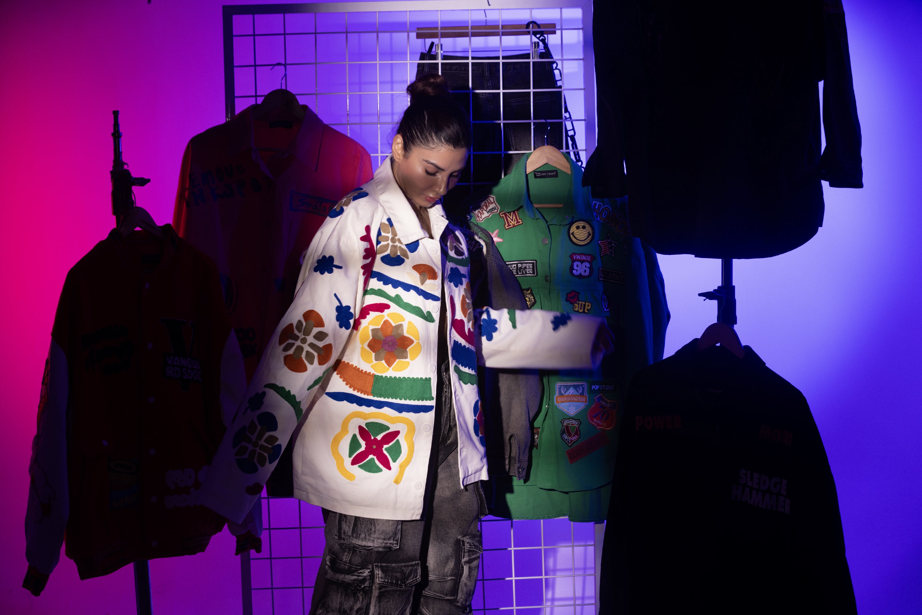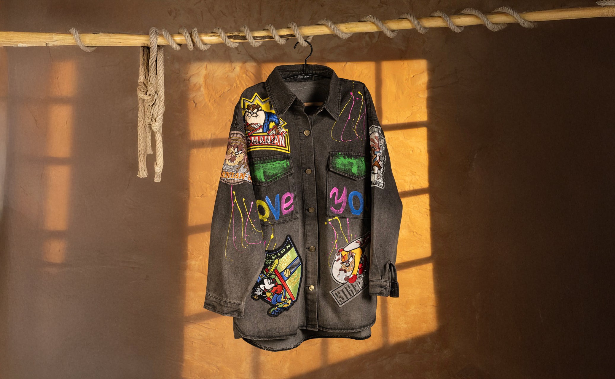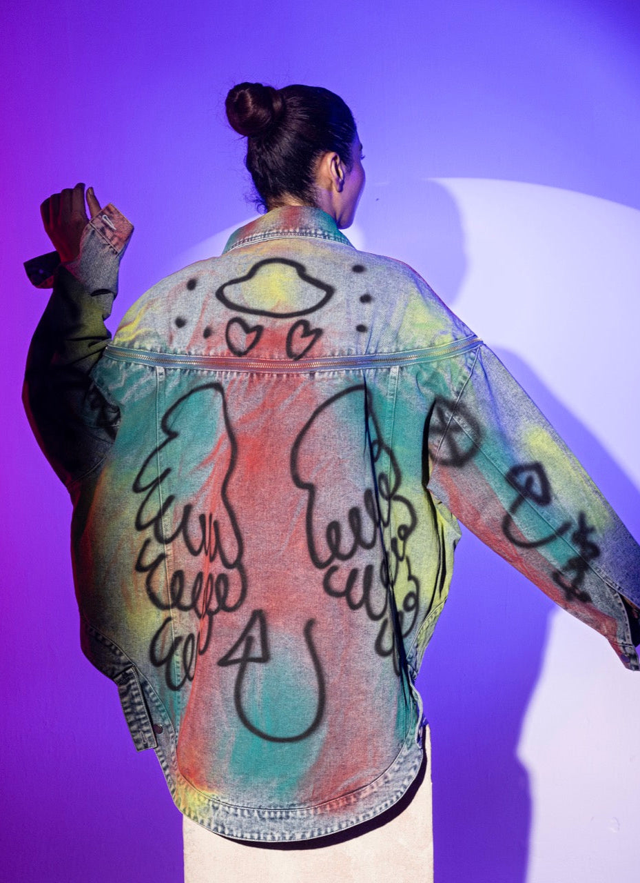 Unleash your playful side with The Graffiti Pop Denim Jacket. Bursting with vibrant patchwork, comici-style graphics, and bold βLOVE YOUβ lettering, this oversized piece is a wearable canvas of street art. Finished with distressed detailing and splashes of neon lines, itβs perfect for those who like their fashion loud, fun, and unapologetically bold.